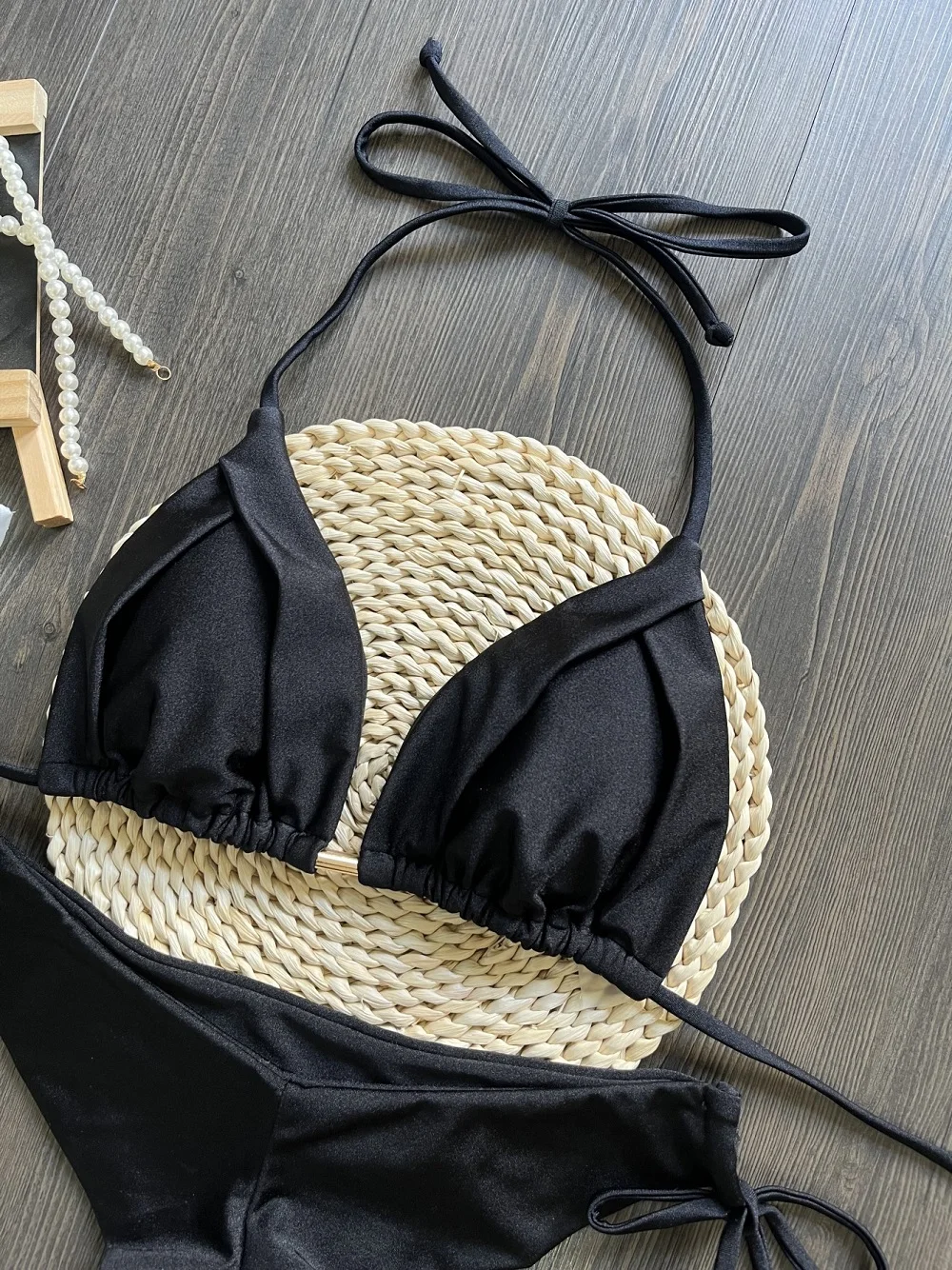 Com top triangular e amarrações ajustáveis, ele se adapta perfeitamente ao corpo, oferecendo sustentação e um caimento elegante. A calcinha possui modelagem que valoriza as curvas e garante um visual sofisticado e moderno.